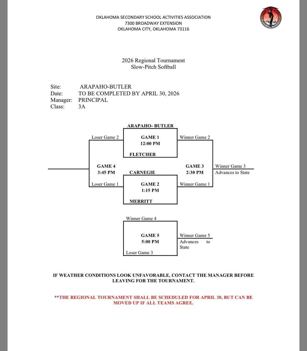 Carnegie is fortunate to host both Baseball and Slow-Pitch Softball on Thursday, April 23, 2026. Baseball is a two-team district with Burns Flat. Slow-Pitch Softball is a three-team district with H...